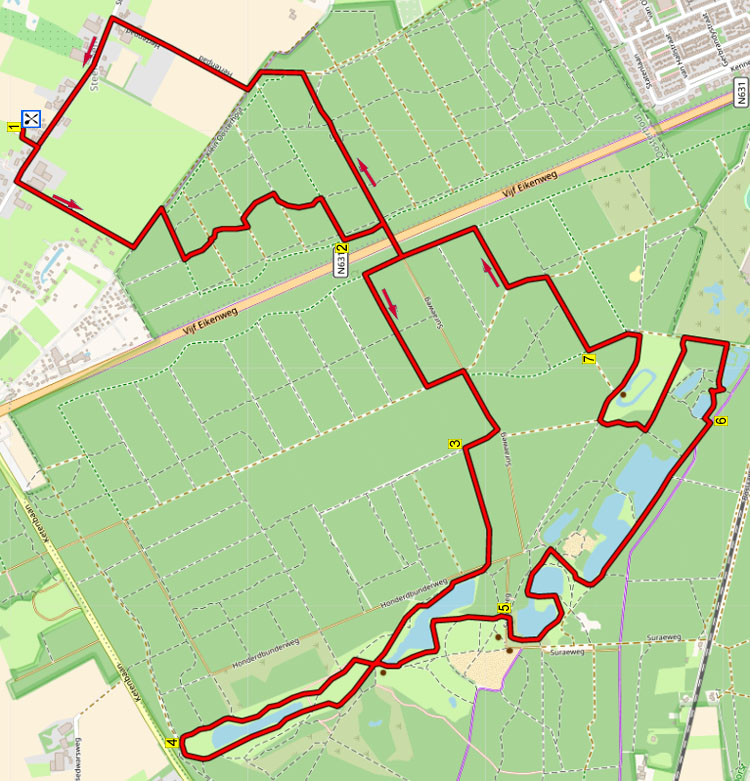 Voorbij twee omgevallen boomstammen gaat u aan de 3-sprong L over het smalle paadje dat over een landweer (verhoging) loopt. Negeer zijpaadjes. Waar het pad niet meer begaanbaar is, gaat u schuin rechts omlaag. Even later loopt u weer RD over de landweer. Aan het einde steekt u de smalle asfaltweg over en loopt u RD over het bospad. Na 25 m gaat u aan de 4-sprong R. Negeer zijpaden en volg het pad met links beneden het eerste ven. Aan de 3-sprong gaat u L omlaag langs het ven. (U bent nu in het natuurgebied Surae). Voorbij mooie plek aan het ven gaat u aan de omgekeerde Y-splitsing RD over het brede zandpad. Aan de Y-splitsing gaat u L over het hobbelige zandpad. Aan de 4-sprong bij houten paaltjes (hier komt u straks terug) gaat u R door een stuk grasland. Aan de T-splitsing gaat u L en negeer meteen zijpad rechts. Negeer zijpaadjes en blijf het brede zandpad volgen met links het langgerekte ven.
